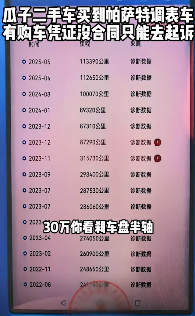 快科技9月1日消息,据博主“拜托了老司机”透露,一位大众帕萨特车主向其反馈称,他在瓜子二手车上买到了调表车。